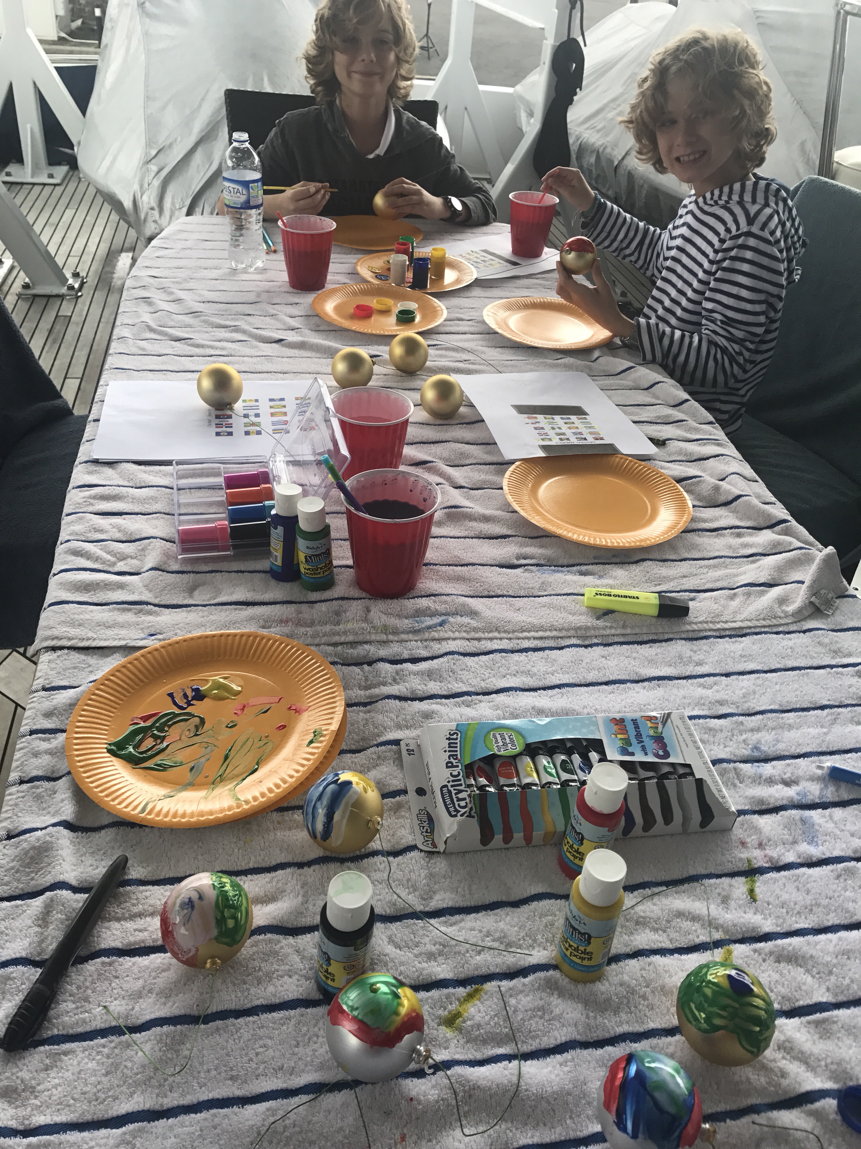 Leaving rainy Trinidad to dive the biggest brain coral In The world in Tobago!! Starting to get in the spirit of Christmas( nothing like home but a great second place) by making and decorating ornaments. We decided to to paint flags of all the countries we visited and draw major monuments of places we have seen. Waiting for Athena to decorate the tree π² completely!!!