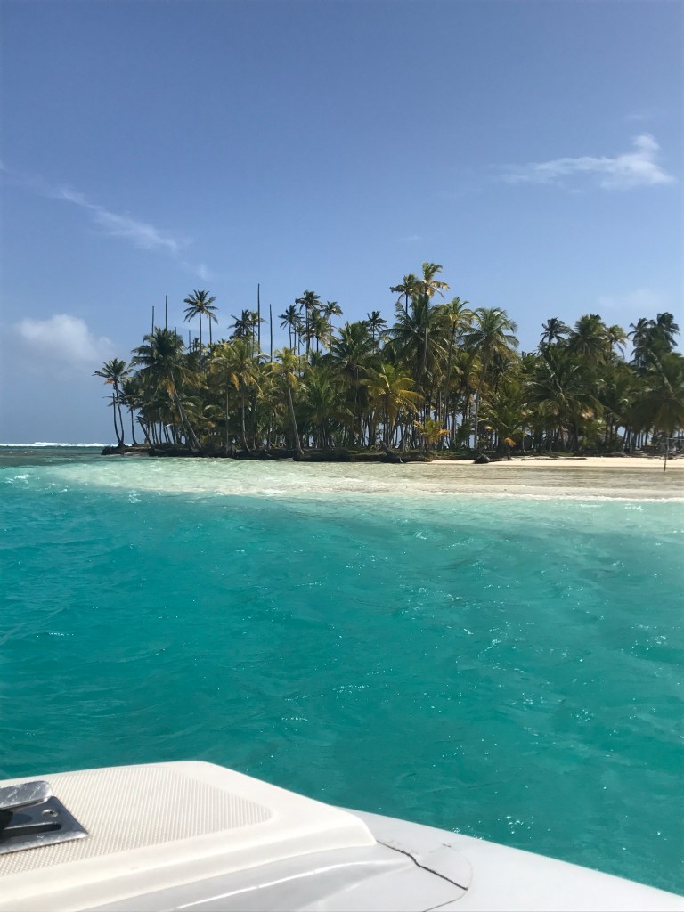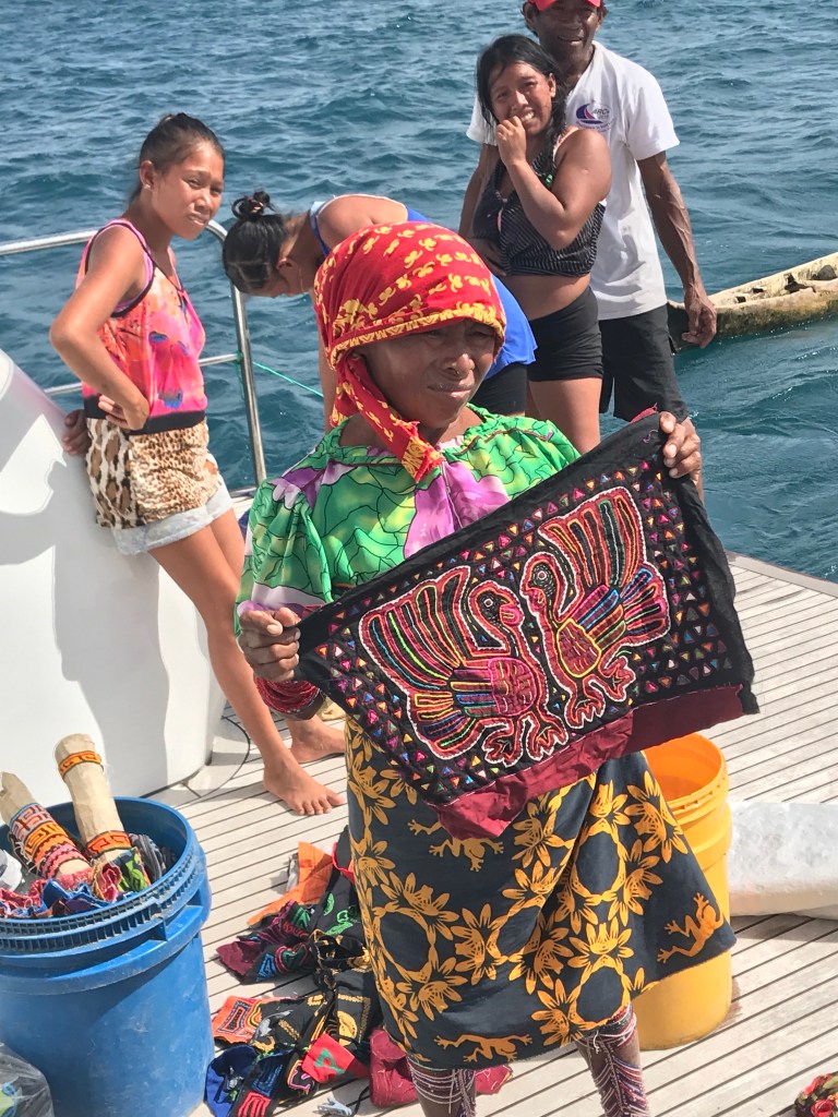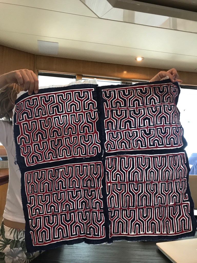 The San Blas Islands of Panama are 378 Islands in the Caribbean Sea, of which 47 are inhibited. We had a warm welcome by the indigenous people( the Gina or Kuna Indians) selling their handy crafts called Molas. A Mola, which originally meant bird plumage, is the Kuna Indians word for clothing, especially blouses, and the word mola has come to mean the elaborate embroidered panels that make up the front and back of a Kuna woman’s traditional blouse. A molar maker places two or three pieces of different colored cloth on top of each other and paste them together. Then she cuts into the top layer cutting out her design. Only the bottom layer remains intact to be the background color and support the stitching of the other pieces. The color of each loop lower level creates the outline of the design. She may then add additional elements as in decorative embroidery, appliquΓ© or different colors from cloth that has been inserted between the layers to complete the intricate design.